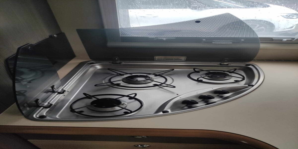 - Coin dinette avec 3 feux gaz + hotte + rangements supérieurs + évier et rangements inférieurs
